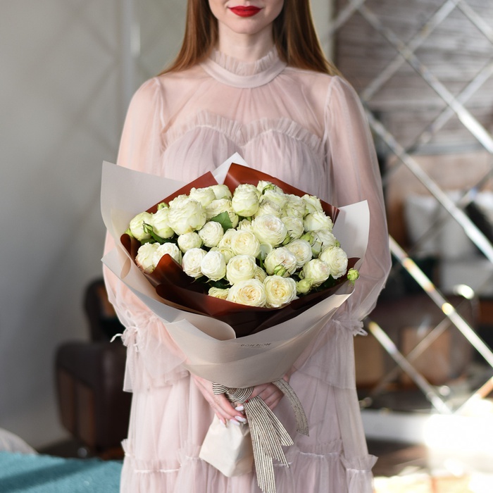 Пионовидный сорт роз Snow World, белого цвета с лёгким зеленоватым оттенком и особенно пышными ветками.