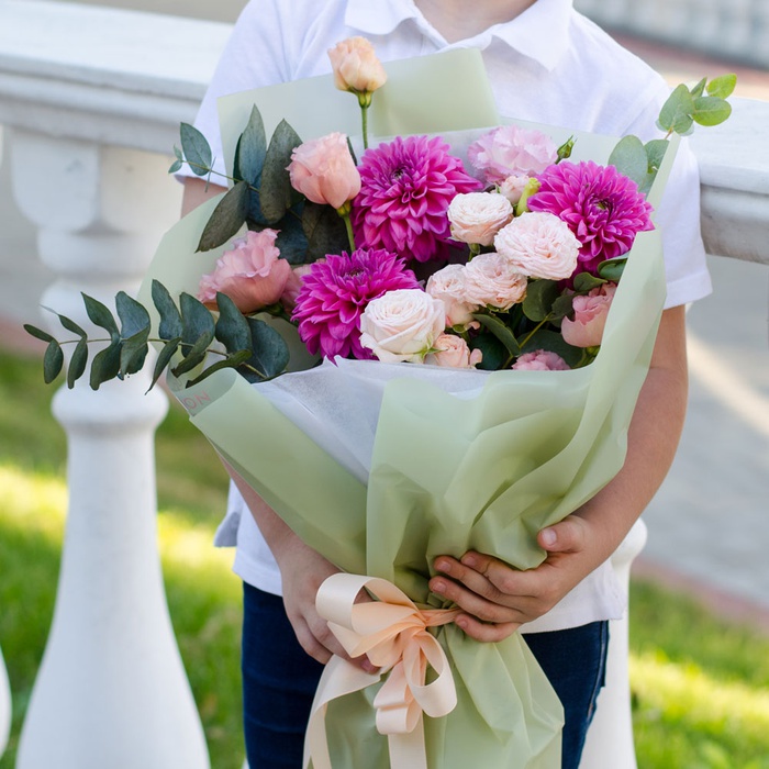 Георгина, эустома, эвкалипт, кустовая роза, упаковка