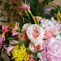Гортензия, мимоза, роза, рускус итальяно, неринэ, тюльпан, гвоздика, листья монстеры, лента