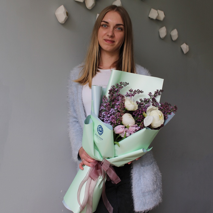 Букет с пионами, тюльпанами и сиренью - это милое и невероятно нежное сочетание. Эти роскошные цветы гармонично дополняют друг друга.