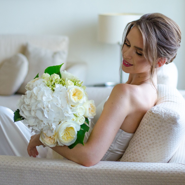 Удивительно нежный букет невесты создаст настроение французкого шика. Букет очень гармоничен и утончен, что соответствует роскошному образу невесты.