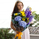 Гортензия, подсолнух, дельфиниум, упаковка.