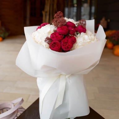 Букет из гортензии и роз "Романтика контрастов" — это изысканная композиция, сочетающая нежную белую гортензию и яркие красные розы. Контраст цветов создаёт неповторимую атмосферу эмоций, отражающую глубину чувств, страсть и нежность одновременно. Этот букет идеально подходит для романтических встреч, празднования особых событий или как подарок, способный по-настоящему удивить и очаровать.