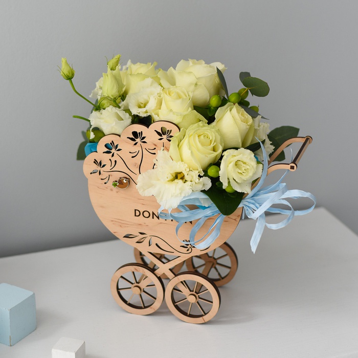 Отличный подарок для мамы и малыша. Белоснежные цветы в деревянной коляске, которую позже можно использовать как коробочку для хранения. Полезный и трогательный сюрприз.