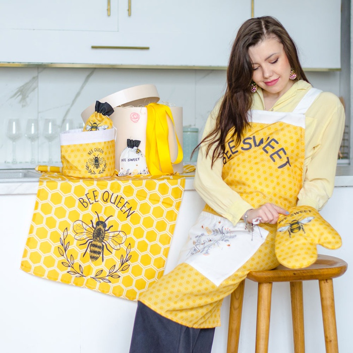 Подарочный набор "Веселая пчелка" - незаменимые аксессуары для кухни, ведь каждая хозяйка нуждается в таких мелочах, как красивая скатерть, красочный фартук и другие принадлежности. Идеальный и полезный подарок с поводом и без.