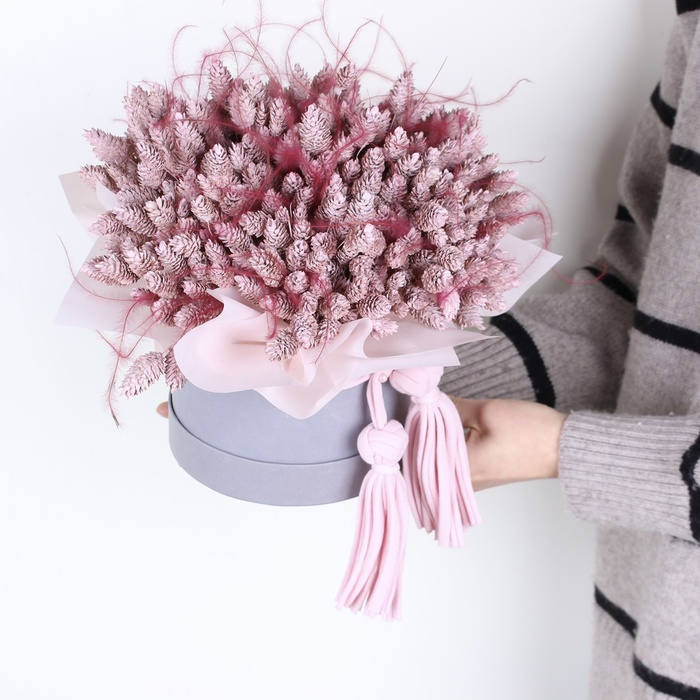 Коробка благородного серого цвета с нежным сухоцветом. Композиция будет жить вечность и украшать интерьер. Отличный подарок для близких, коллег, бизнес-партнеров.