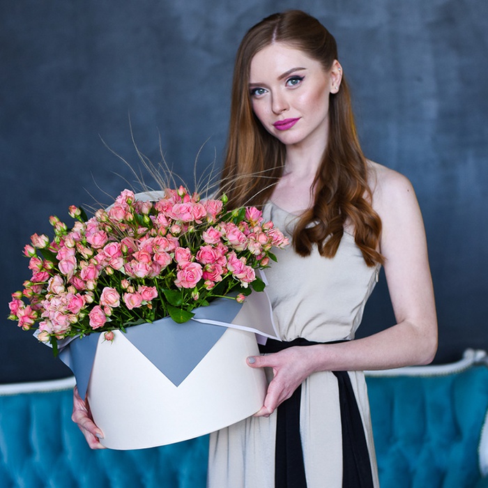 Огромная шляпная коробка полная мелких нежных розочек и пушистых веточек стифы - удивляет и умиляет!