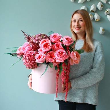 Коробка, садовая роза, гортензия, амарантус, астильба, флебодиум, эвкалипт.