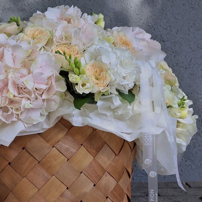 Корзинка, гортензия - 13 шт, фрезия - 11 шт, роза - 15 шт