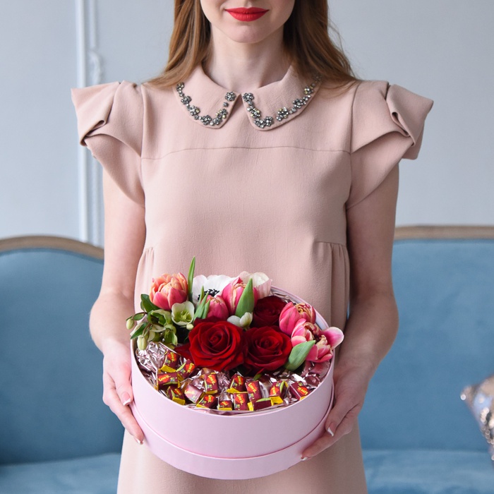 Что может быть лучше цветов в сочетании с жевательными резинками "Love is" в стильной шляпной коробке?