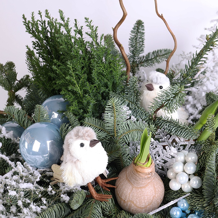 Кипарисовик в горшке - 2 шт, хвоя - 3 шт, аспарагус - 1 шт, корилус - 3 шт, кашпо боул, птица - 2 шт, амариллис в воске - 2 шт, новогодняя игрушка - 3 шт