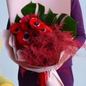 Романтичный букет из красных анемонов с экзотической зеленью. Оригинальный подарок на День влюбленных!