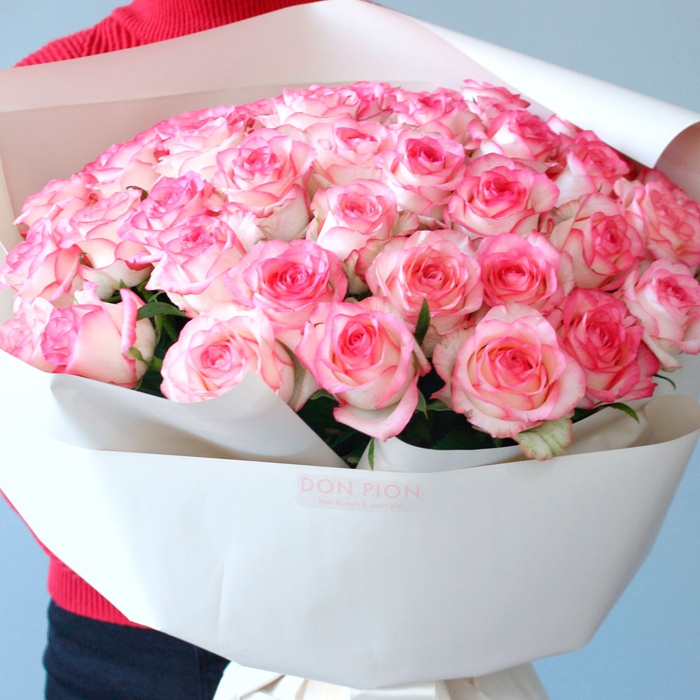 Букет роз необыкновенной красоты, обладает двухцветным окрасом - белые лепестки с насыщенно-розовой окантовкой, смотрится празднично инарядно!
