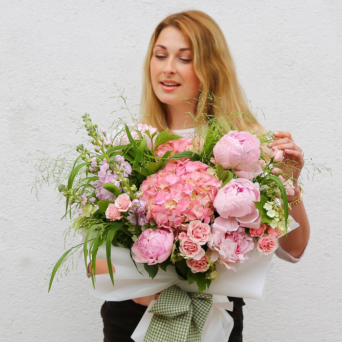 Гортензия, пион, роза, маттиола, вибурнум, колоски, бант