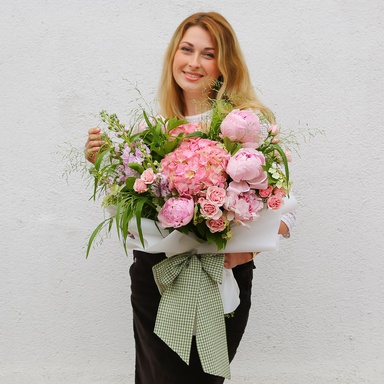 Гортензия, пион, роза, маттиола, вибурнум, колоски, бант
