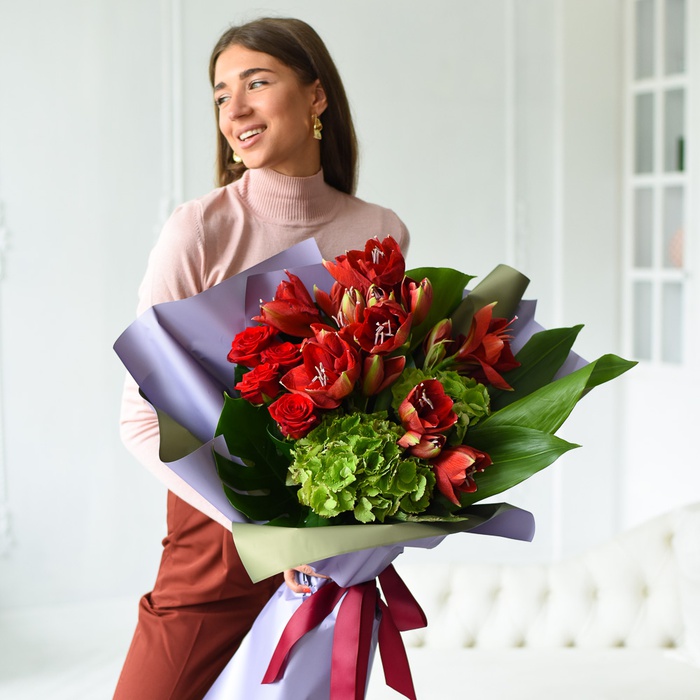 Пышный праздничный букет с амариллисами и гортензией. Амариллис идеально подойдет в качестве букета близким, коллеге, партнеру по бизнесу или шефу.