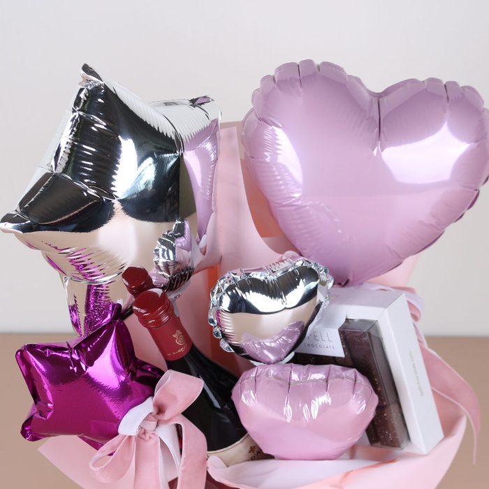 Коробка, фольговані кульки в асортименті, сертифікат на вино, цукерки із солоною карамеллю від Spell
