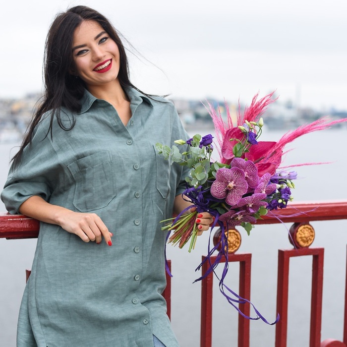 Яскравий букет з екзотичних квітів. Зовсім тонкий натяк на щирі почуття. Прояву такої любові зрадіють і улюблені, і подружки, а стильній сумці знайдеться застосування в житті кожної з них.
