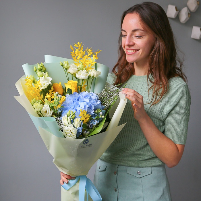 Гортензія, еустома, троянда, оксіпеталум, гілочки рускуса сухоцвіту, лист монстрери, упаковка.