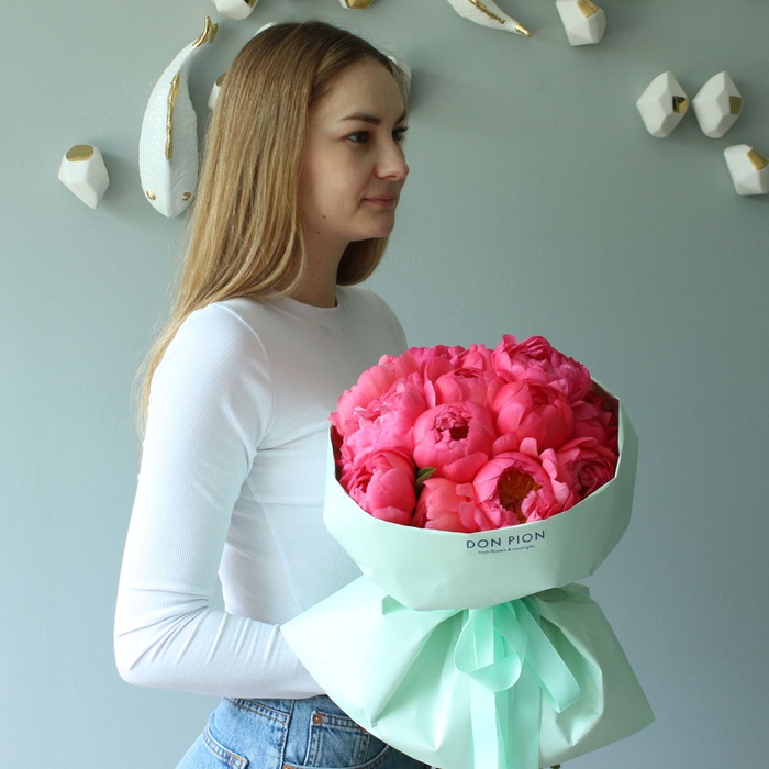 Цей яскравий букет з коралових півоній подарує радість та свіжість, піднімаючи настрій.