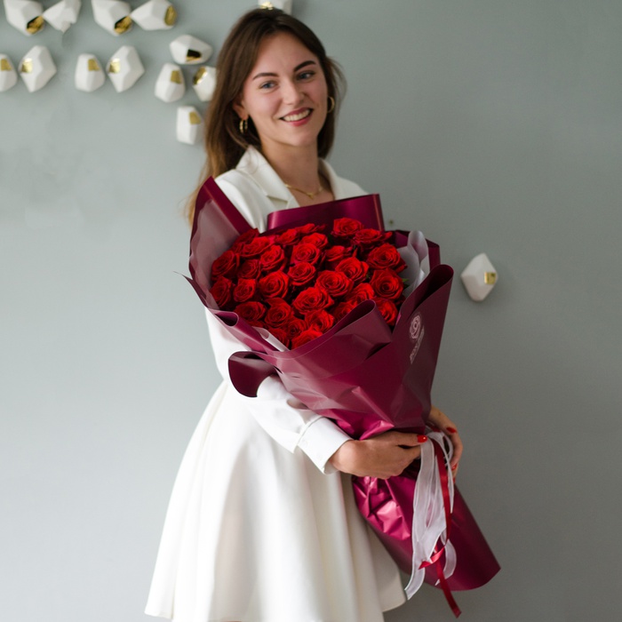 Букет із 35 червоних троянд - це просто приголомшливий букет, яких можна подарувати на свято і просто так дружині, дівчині, мамі, колезі, чоловікові. Усі будуть у захваті від такого букета.