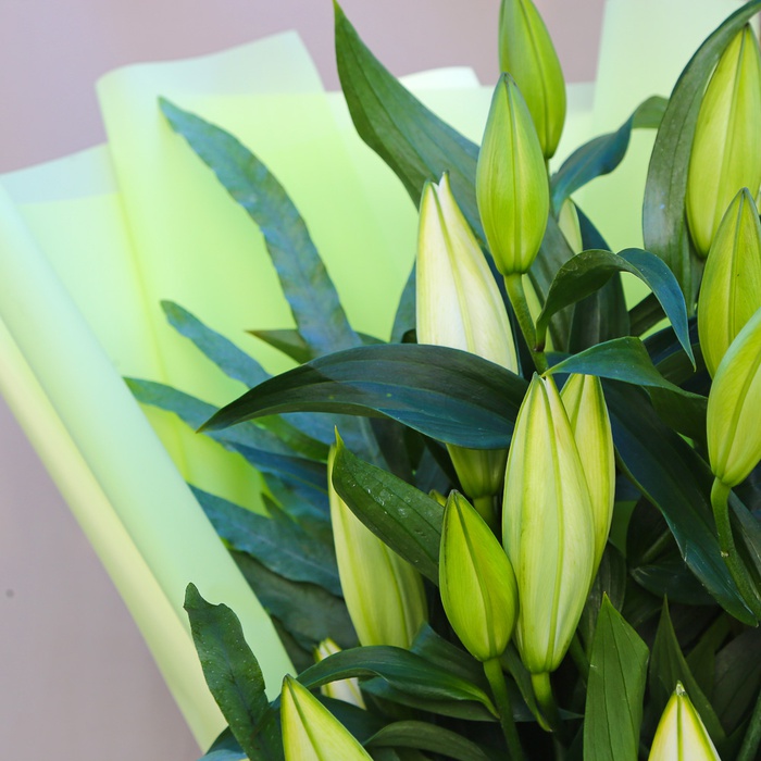 5 голландських лілій, листя флебодіума, упаковка