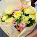 У букеті чудово поєднуються еустома та півонії. Літній, сонячний настрій із цим букетом – гарантований.