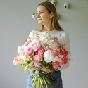 Пишний, ніжний букет виглядає розкішно і жіночно, з легким ароматом романтичних півоній.