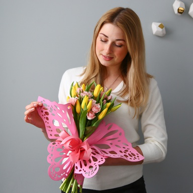 Тюльпан, троянда гілка Майоліка, упаковка Метелик.