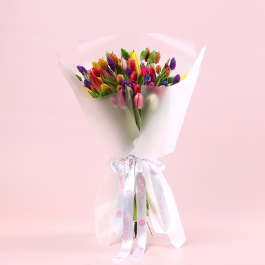 Букет «Весняні барви» — це яскраве втілення радості, свіжості та пробудження природи. Композиція з 25 тюльпанів мікс наповнена живими весняними відтінками, які створюють настрій легкості та щирих емоцій. Різнокольорові тюльпани гармонійно поєднуються з фарбованим фалярисом, що додає букету сучасного стилю, обʼєму та оригінальної текстури. Такий букет стане чудовим подарунком до 8 Березня, дня народження, весняного свята або як теплий знак уваги без приводу.