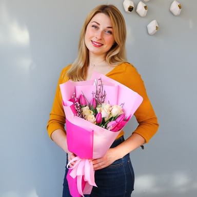 Жіночний яскравий букет в рожевих відтінках. Ніжна троянда Шарман і весняні квіти з ароматною Джінестра, роблять цей букет універсальним як для мами, так і для подруги.