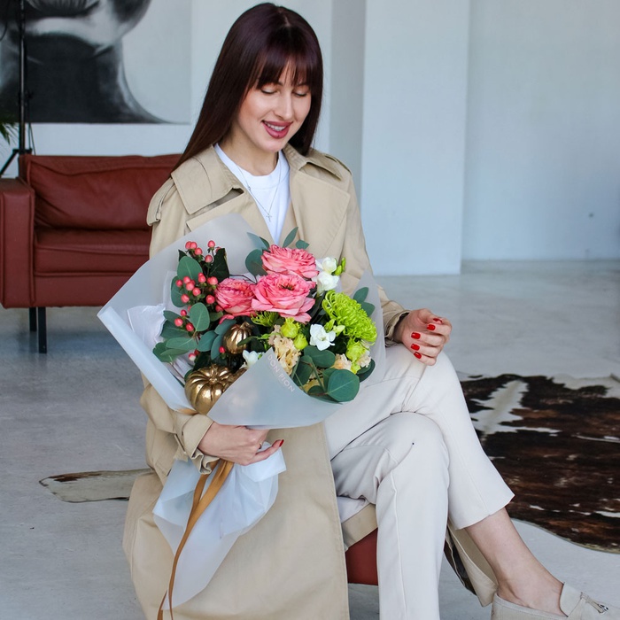 Еустома, гарбуз, троянда, хіперикум, фрезія, евкаліпт, хризантема