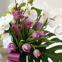 Троянда, дабл тюльпан, гілка фаленопсис, фрезія, весняні гілочки, лист монстери