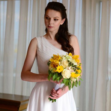 Наречена буде виглядати шикарно і неперевершено разом з цим приголомшливим букетом з пишної гортензії, троянд і екзотичного цимбідіума із зеленню евкаліпта.