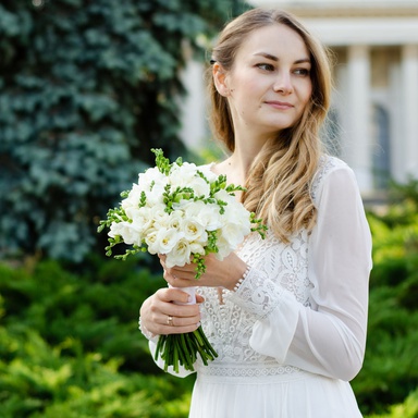 Букет складається з безлічі ніжних білих фрезій з їх чудовими бутонами, які відкриваються у витончені та ароматні квіти. Білий відтінок фрезій надає букету свіжості, чистоти та романтичності.
