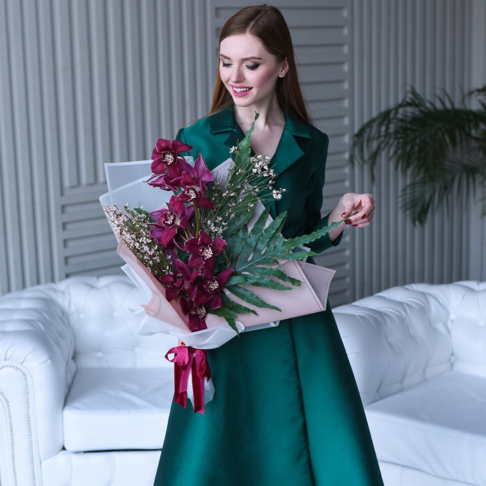 Ароматний букет з екзотичної зелені і орхідеї Цимбідіум, наповнить ароматом весни будинок і офіс.