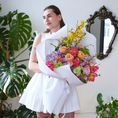 Букет «Квітковий настрій» — це яскрава та гармонійна композиція, яка дарує емоції радості, тепла та натхнення. У цьому букеті поєднуються ніжні відтінки та живі акценти, створюючи ефект легкості й свіжості. Квіти доповнюють один одного, формуючи об’ємну та стильну композицію, яка виглядає сучасно й водночас дуже ніжно. Такий букет стане чудовим подарунком для будь-якої події — від щирого привітання до романтичного сюрпризу, адже він здатний підняти настрій і наповнити день позитивними емоціями.