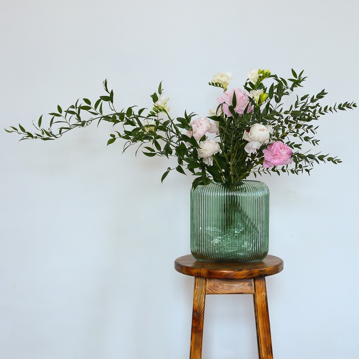 Ваза 25*25*15 см, півонія мікс - 7 шт, фрезія - 5 шт, рускус - 2 ч, евкаліпт парвіфолія - 1 ч
