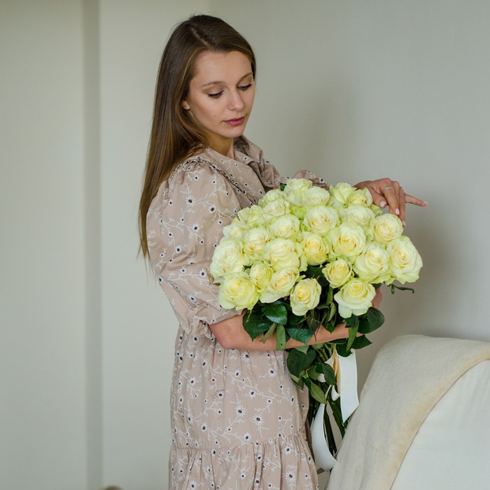 Монобукет з білої троянди виглядає елегантно і ніжно. Підійде як для компліменту дівчині, так і колезі до дня народження. Універсальний варіант.