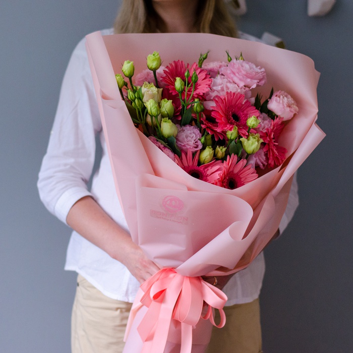 Прекрасні пишні та повітряні еустоми та гербери у дизайнерській упаковці - приведуть у захват одержувача та подарують позитивний настрій.