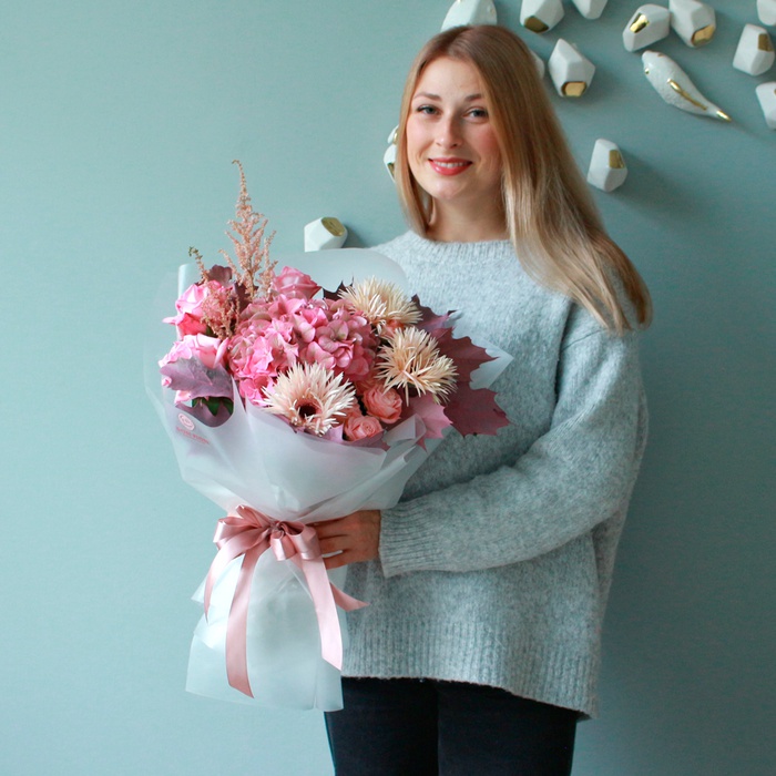 Гортензія, гербера, астильба, троянда, куеркус, упаковка.