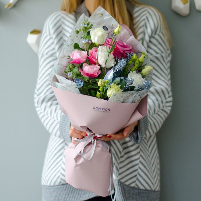 Цей букет - справжня перлина серед квіткових композицій. Рожеві троянди виражають ніжність та відчуття, створюючи атмосферу кохання та романтики. Біла еустома додає нотку чистоти та вишуканості, завершуючи композицію неперевершеною грацією. Придбавши цей букет у магазині DonPion, ви отримуєте не тільки красу природи, але й впевненість у високій якості квітів та професійному підході до їх створення.