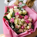 Троянда мікс імпортна – 21 шт, троянда кущова – 5 шт, евкаліпт, упаковка.