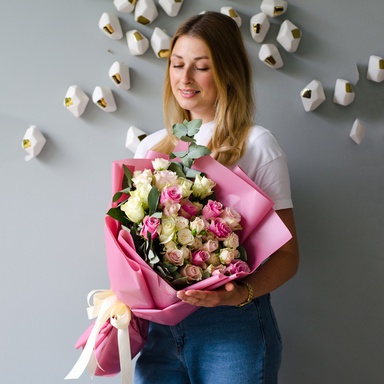 Троянда мікс імпортна – 21 шт, троянда кущова – 5 шт, евкаліпт, упаковка.