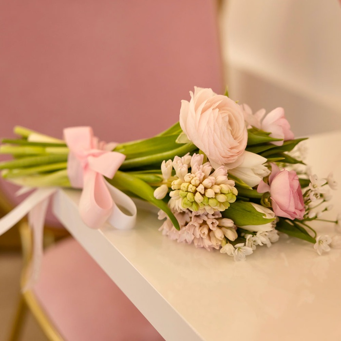 Гіацинт, тюльпан, ранункулюс, аліум, стрічка