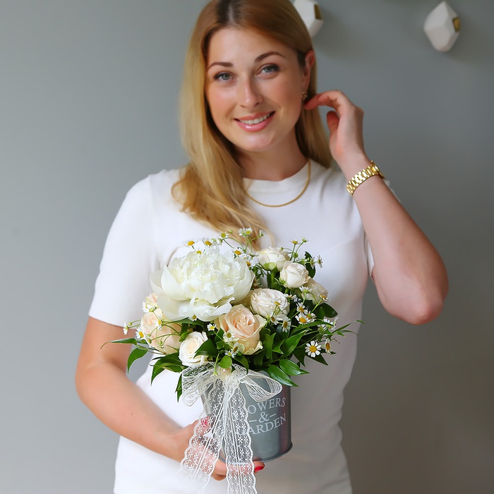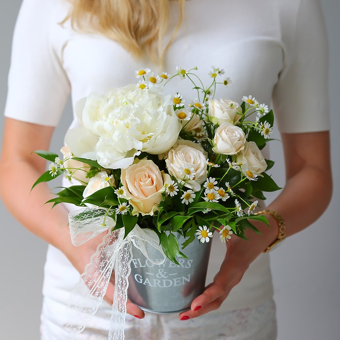 Півонія, танацетум ромашка, троянда, зелень, металеве кашпо