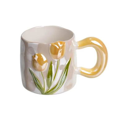 Додайте нотку весняної ніжності та вишуканості у ваш ранок! Ця неймовірна чашка — справжній витвір мистецтва, виготовлений з якісної порцеляни. Головна родзинка — об'ємні 3D-квіти тюльпанів, які ніби "розквітають" просто на стінках, створюючи унікальний тактильний ефект. Образ довершує велика, перламутрова ручка незвичайної округлої форми, яка зручно лежить у руці та додає чашці особливого шарму. Завдяки комфортному об'єму 400 мл та затишній формі, вона ідеально підходить для лате, какао або вашого улюбленого чаю. Це не просто посуд, а готовий вишуканий подарунок, який гарантовано справить враження та прикрасить будь-яку кухню.