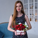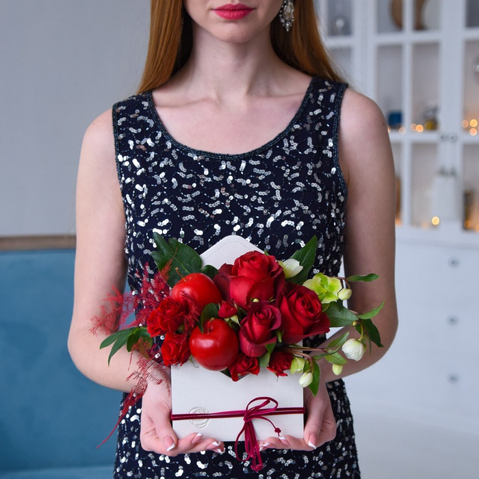 Ексклюзивна дерев'яна коробочка від Don Pion з червоних троянд, фруктів в глазурі, хелеборусом.