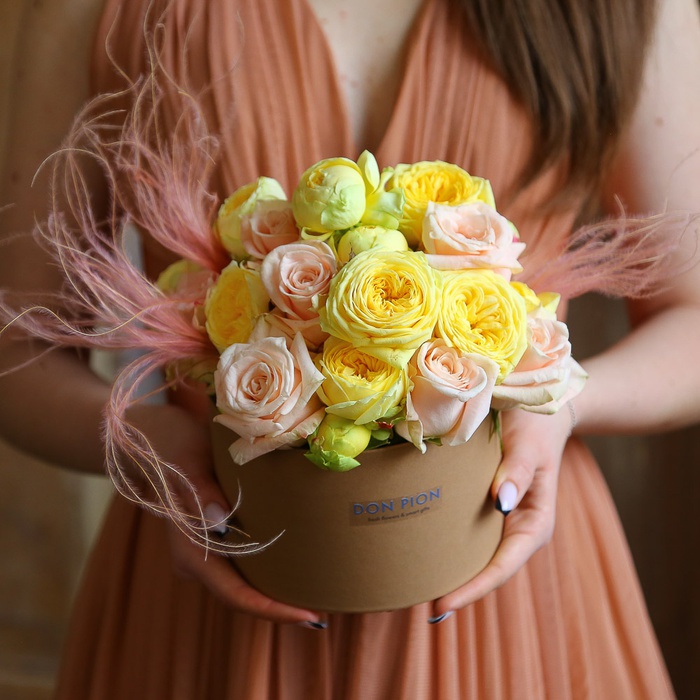 Троянда Кімберлі, Піоні Бабблз, пухнаста стіфа, коробка