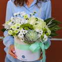 Ніжна хризантема в шляпной коробці з екзотичною зеленню і сукулентами. Композиція зібрана в спеціальну губку. Вона просякнута водою, яка має властивість випаровуватися. Тому Don Pion радить через день поливати квіти холодною водою.